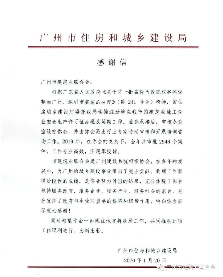为提高我市建筑施工企业申办安全生产许可证的效率,切实落实“放管服”的需求,2019年,我会配合市住建局举办了6期“建筑施工企业安全生产许可证申报资料要点解读”培训会,首次申请安全生产许可证企业、申请安全生产许可证延期的资料管理人员900余人参加了培训。通过培训,大大提高了安全生产许可证的资料质量和通过率。去年,我会派出专家协助审批安全生产许可证办理(延期)案件共2946个,审核工作专业及时,实现零投诉,工作得到了市住建局的认可,并特此发来感谢信。